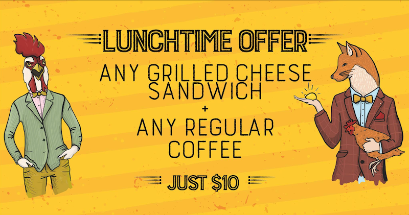 This `Flash Sale` Deal is..... This `Flash Sale` Deal is..... More Photos Reviews Get Directions (Google Maps) Lunchtime Offer Any grilled cheese sandwich + Any regular Coffee Just $10 Latest Oldest Lowest Rating Highest Rating Lowest Reviews Highest Reviews Leave a ReviewYou must be logged in to post a comment. Get Directions Previous Next