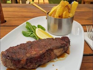 250g sirloin steak with our truffle fries and red wine jus for $20. -